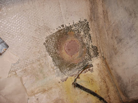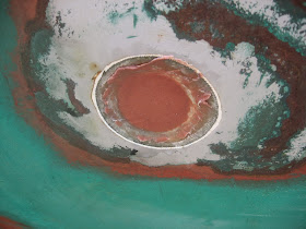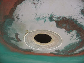 Here is a hole left from a 1 1/2" PERKO sea-cock, I have three of these and three from 3/4' sea-cock. I ground from the outside to within an 1/8" of breaking through. Then, what I have no pictures of is that on the inside of this hole I then ground another taper around the circumference although much smaller than what is on the outside.