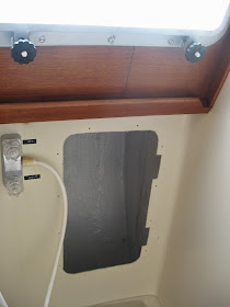 Finally, we made life easier for the mutts. We carpeted the companionway ladder, to make it easier for them to climb/descend.