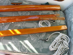 Prettying it up with the leather work and we are just about done. I also made a couple of teak cleats for the mast and boom, threw on a few coats of varnish ...